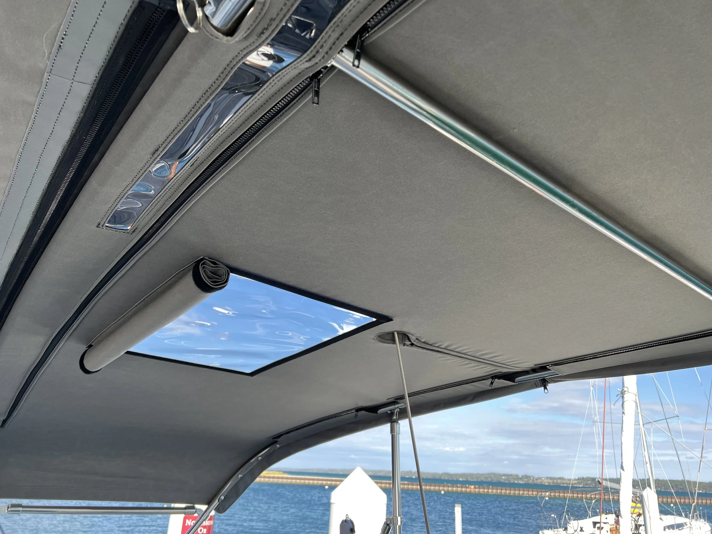 Typical setups include a large well supported Dodger Frame, a wide railing mounted Bimini with coverage targeting the helm, and a large Connector between the two. This gives flexibility to open up the cockpit on those warm sunny days but get the overhead coverage you need when the clouds roll in. Optional features like wind/spray extended sides can make the cold weather sailing more pleasant maintaining visibility. Fully enclosing the cockpit can be challenging on this style boat but for full bug and rain protection at anchor options abound.