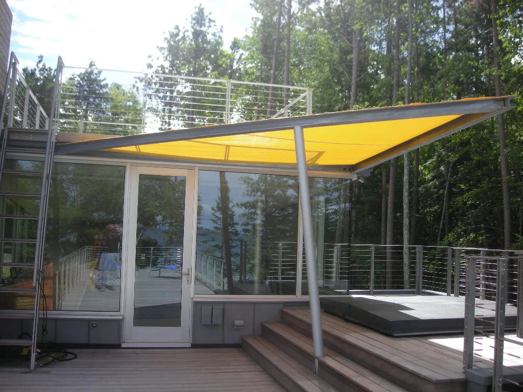 We have a wide range of custom shade options that can be easily rolled up and down via rope and pully, hand crank, or motor. Using durable shade fabrics like Serge Ferrari’s Soltis 92 or Awntex 160, with shade factors of 70 - 95%, we can create a custom, durable, architectural grade shade that will hold up for seasons of enjoyment.